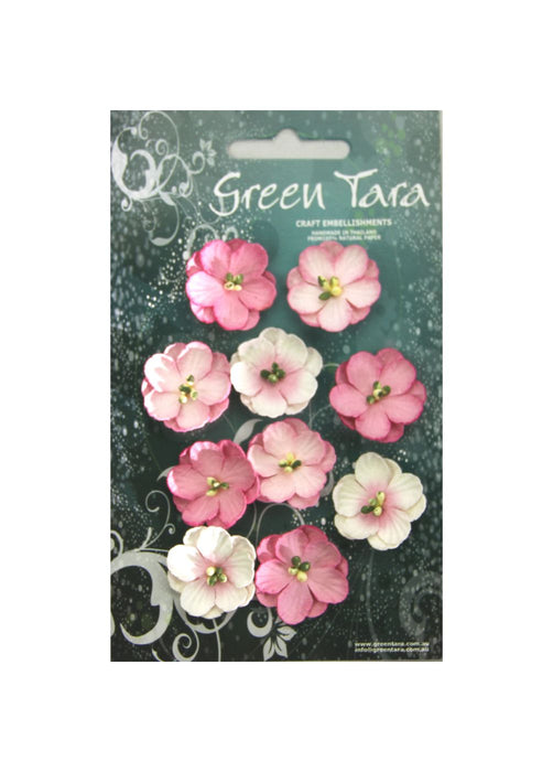 Green Tara Mini Flowers are 28mm and each package contains 10 flowers. Each flower is made from 100% natural paper. We have 12 colour themes available. The flowers are in colour matching shaded sets. Perfect for complimenting colour-themed layouts, cards or off the page projects.