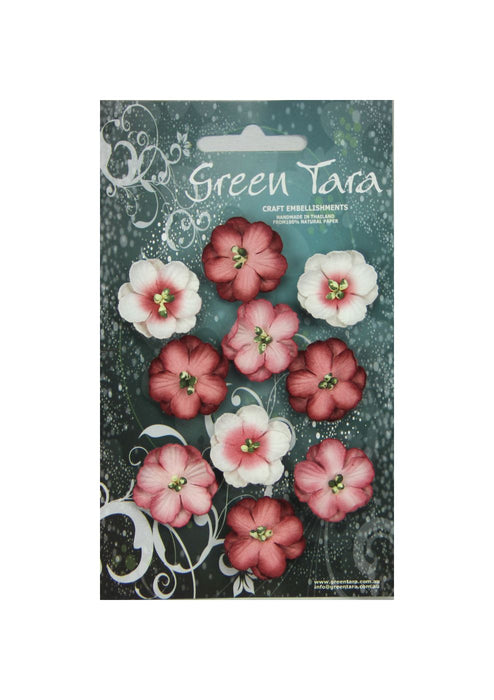 Green Tara Cherry Blossom Flower Packs 28mm. Each flower is made from 100% natural paper. We have 11 colour themes available and each pack contains 10 28mm flowers in colour matching shaded sets. Perfect for complimenting colour-themed layouts, cards or off the page projects.